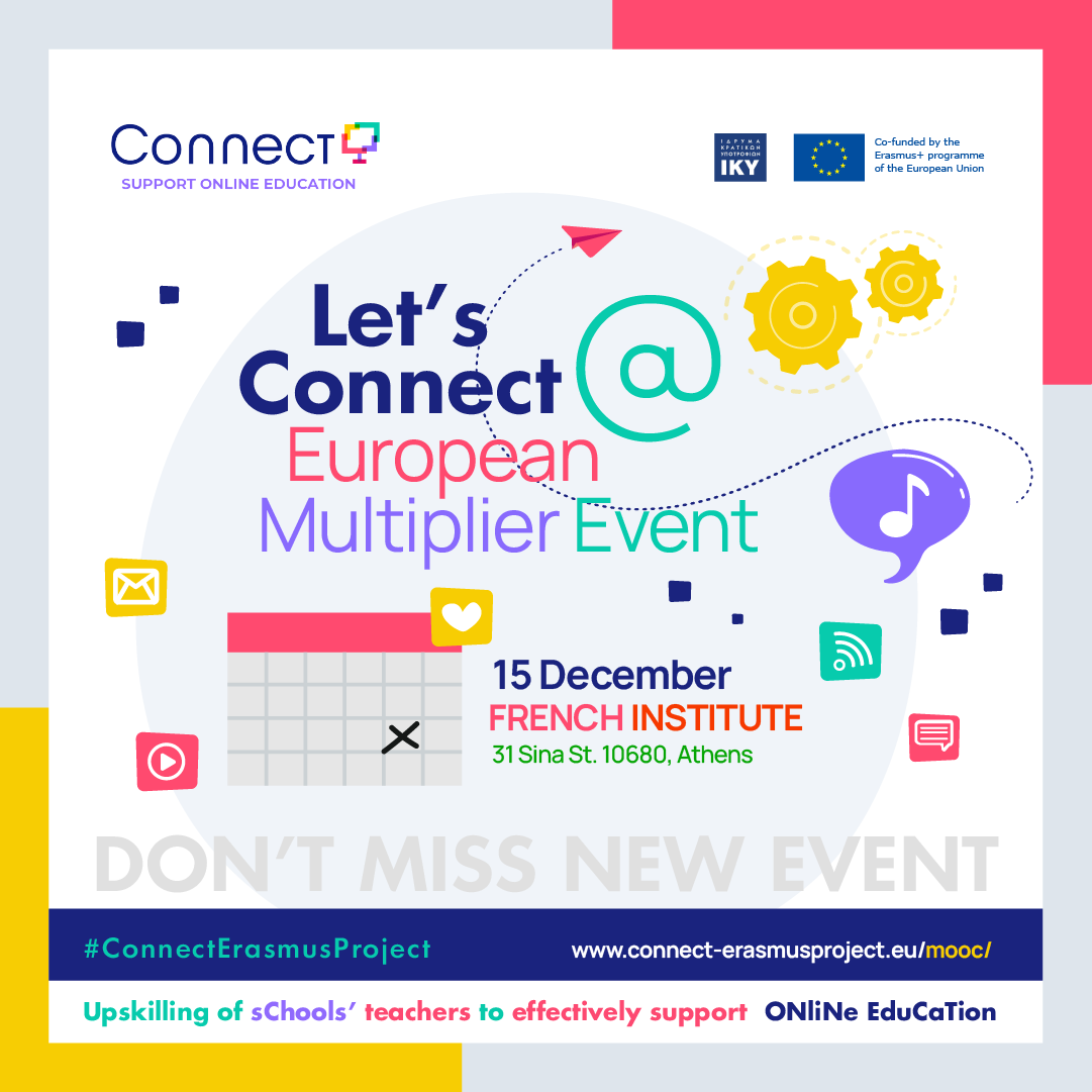 The European Multiplier Event (EME) of CONNECT project will take place at Athens, Greece 15 December 2022. The EME will be hosted at the French Institute, 31 Sina Str, Athens and recent developments and outcomes of the CONNECT project will be presented to European teachers, school leaders and educators.
