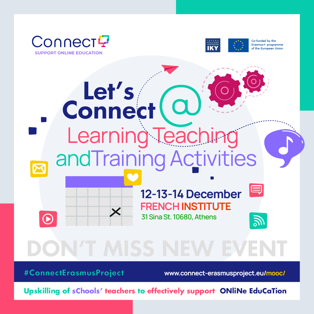 The Learning Teaching and Training Activity (LTTA) of CONNECT project will take place at Athens, Greece 12, 13 & 14 December 2022. The LTTA event will be hosted at the French Institute, 31 Sina Str, Athens and 30 teachers from Cyprus, Greece and Italy will meet and participate in various interactive sessions and workshops.